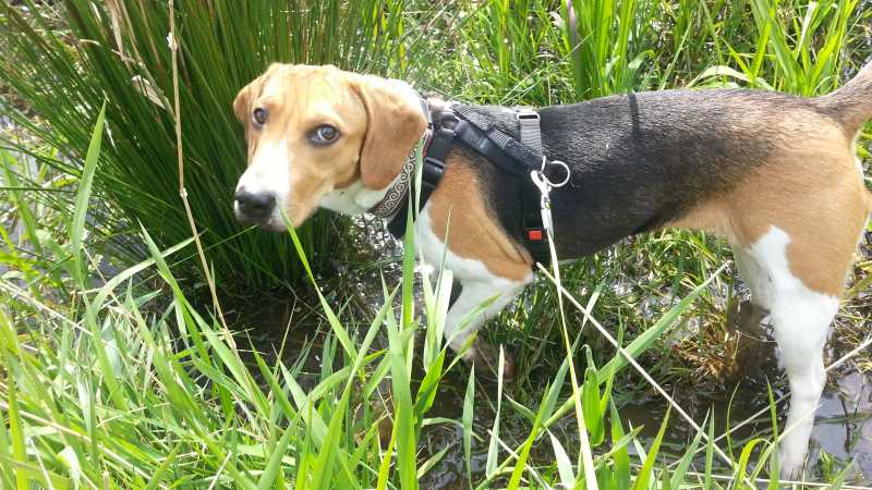 Soeben von einem gemeinsamen Spaziergang mit Freunden zurück. Es war genau die gleiche Truppe wie am vergangenen Sonntag zum Beaglestammtisch. Die Sonne lachte und alle waren froh. Unterwegs hat Tiffany die Beschaffenheit eines Teichs kennengelernt und war neugierig. Ins Wasser geworfene Leckerlies fand sie interessant und das sumpfige Ufer nicht merkwürdig.