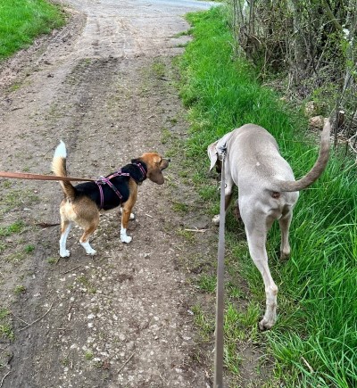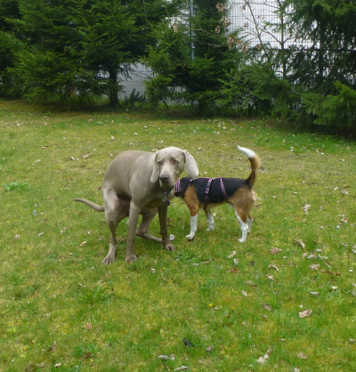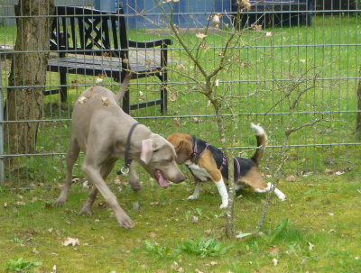 Der Reihe nach: Am frühen Nachmittag haben wir uns außerhalb von Seppls Einzäunung getroffen. Beide, mini Seppl und Genscher, der mindestens viermal so groß und stark ist wie Seppl, lernten sich an der Leine auf einem kleinen gemeinsamen Spaziergang kennen. Seppl war zunächst doch über die imposante Statur von Genscher erstaunt - so Einen hatte er ja noch nie gesehen ...