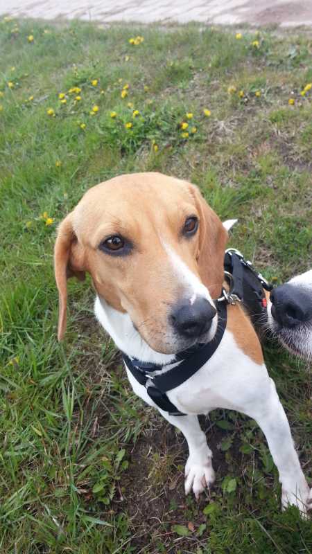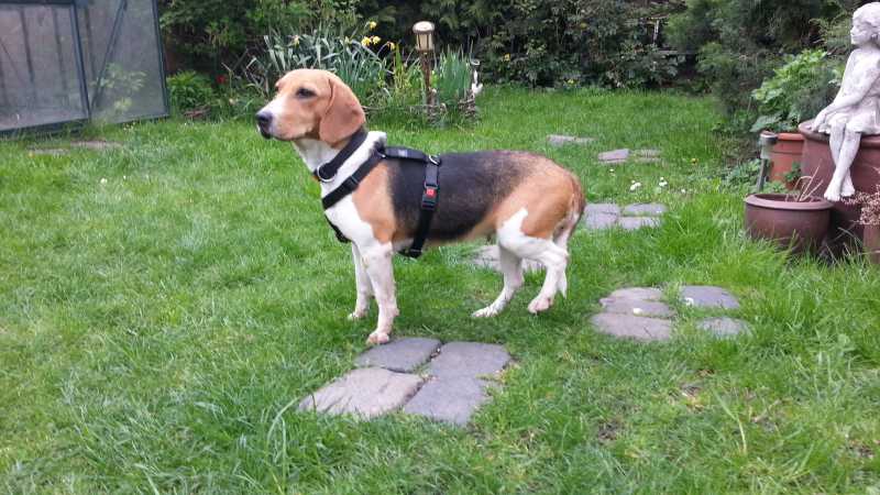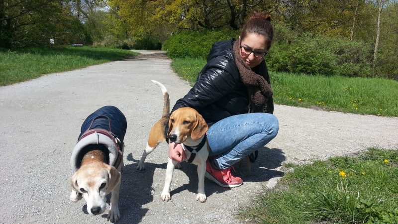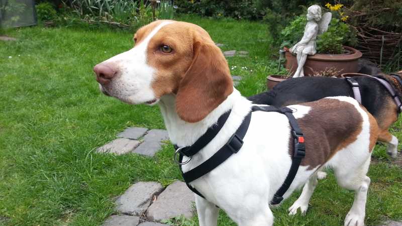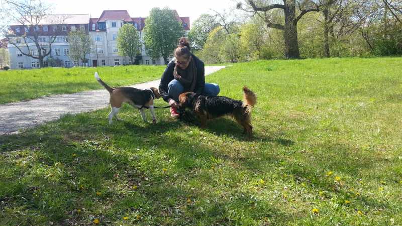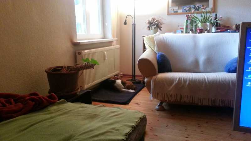 Nach wie vor kauerte sie unbeweglich in ihrem Eckchen. Als ich mit Lucie kam, um sie zum Spaziergang abzuholen, wurde sie aber plötzlich aufgeschlossen und trabte durch die Wohnung. Der Spaziergang verlief wieder super. In belebter urbaner Umgebung hat sie schon immer wieder etwas Angst. An geparkten Autos vorbei- oder gar zwischendurch zu laufen, ist nicht ganz einfach. Geräuschempfindlich ist sie auch. Die Schreckhaftigkeit hält sich aber in Grenzen - panisch kenne ich von meinen früher anders. Sobald man die Straßen hinter sich gelassen und die grüne Weite erreicht hat, merkt man ihr ihre Vergangenheit überhaupt nicht an. Begleithundeprüfung würde sie noch nicht schaffen, aber es ist - sicher mit kleinen Ausnahmen - kein Problem, sie an der Leine in die gewünschte Richtung zu führen. Wenn sie nicht hinten schnüffelt, dann gern möglichst weit voraus, sie läuft schneller als der gewöhnliche Mensch. Aber ohne großen "Druck" lässt sie sich zum Weitergehen, Richtungswechsel usw. bewegen.