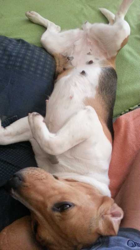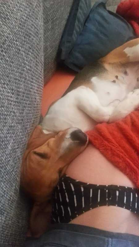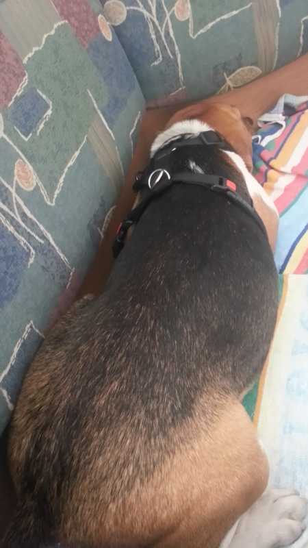 Zu dem Tag kann ich nicht viel sagen. In der PS hat sie mehr oder weniger nur in ihrer Ecke im Flur gelegen. Kam nicht ins Zimmer. Hat in der Wohnung weder mit Hund noch mit Mensch interagiert. Läufigkeit mit Blut hier und dort hat eingesetzt. Fressen und Trinken ja.