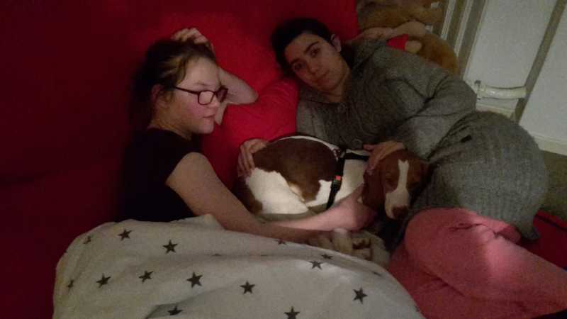 Der Spaziergang war für Hugo sehr großer Stress. Aber er hat es geschafft! Und danach war Entspannung mit meinen großen Töchtern, seinen zwei Menschenfreundinnen, auf dem Sofa angesagt!